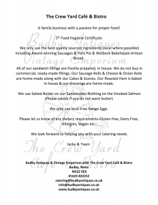 Advance bookings only & if in high demand we will pop two/three time slots on. Don’t worry you won’t need to rush like you do some places because of this & we won’t over book-Purely to help us be organised & cope with potential demand. The menu for the day will be on here shortly-If you wish to pre book we will then contact you directly with a menu & price. Either email info@budbyantiques.co.uk or call 01623 822252 ?